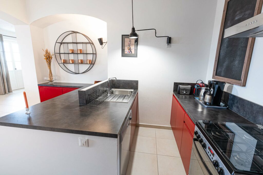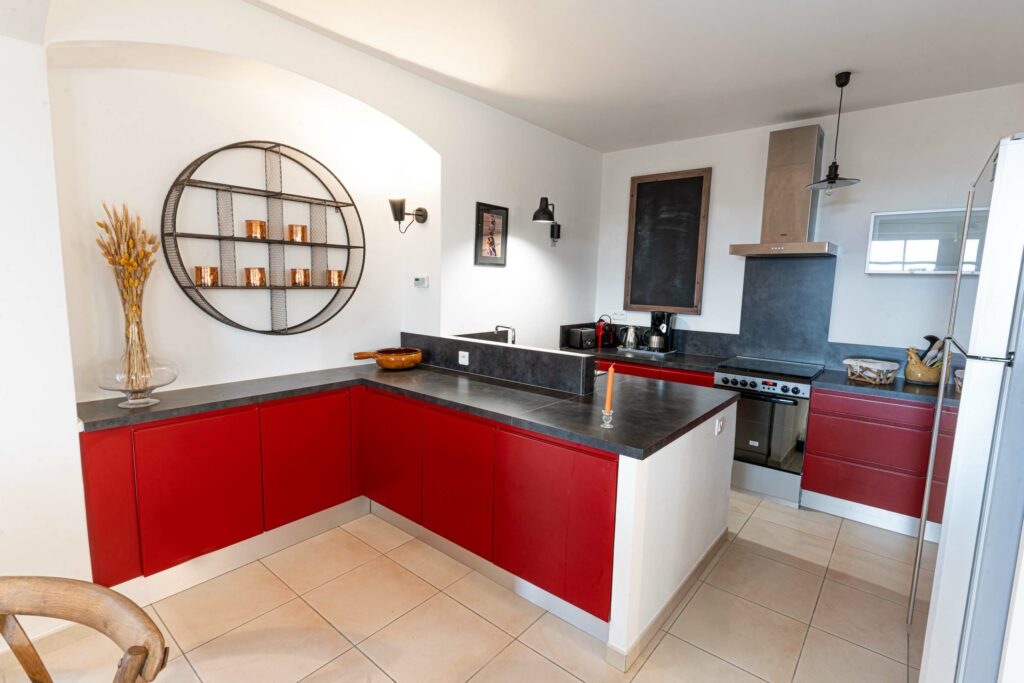 – Cuisine ouverte totalement équipée : Réfrigérateur/congélateur, cuisinière, lave-vaisselle, micro-ondes, cafetière…